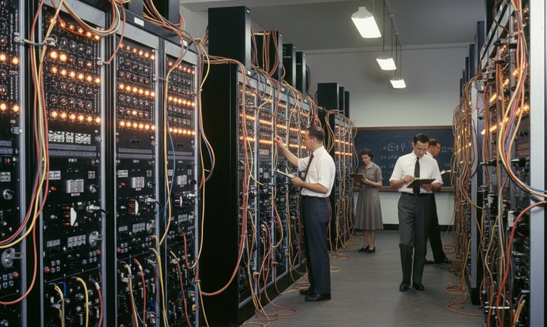 Programação "Manual": Programar o ENIAC não era digitar linhas de código como hoje. Era um processo físico de reconfigurar cabos e interruptores – uma tarefa que podia levar dias ou até semanas para mudar um programa. Cada "cálculo" era como montar um circuito diferente.